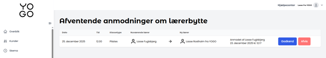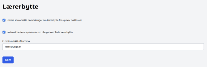 Gå til YOGO admin → Indstillinger → Lærerbytte