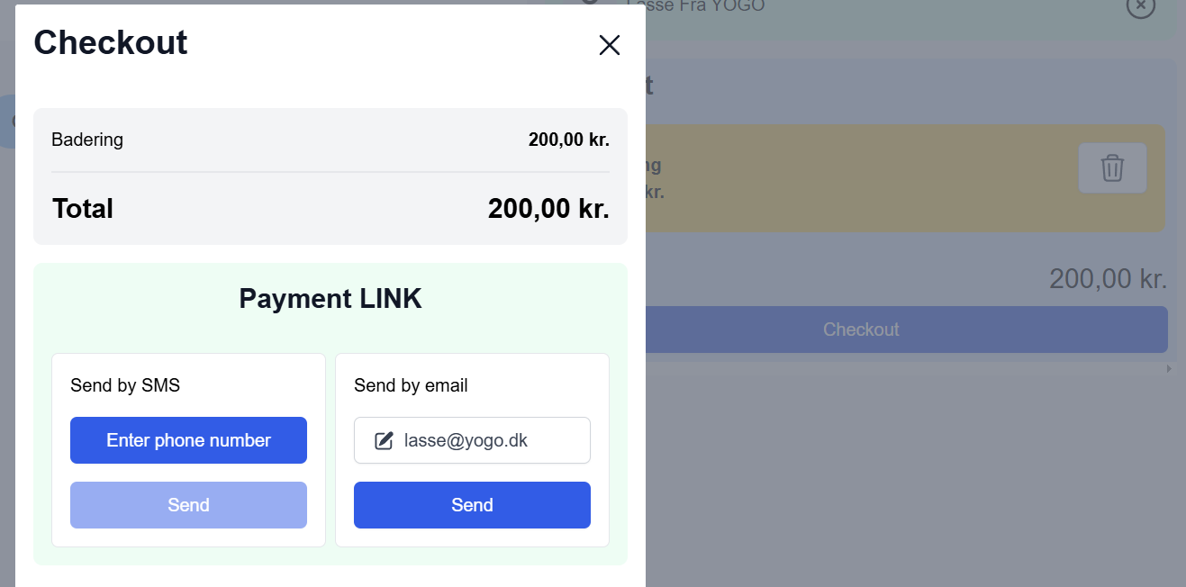 Vælg om du vil sende et betalingslink til kunden via SMS eller e-mail