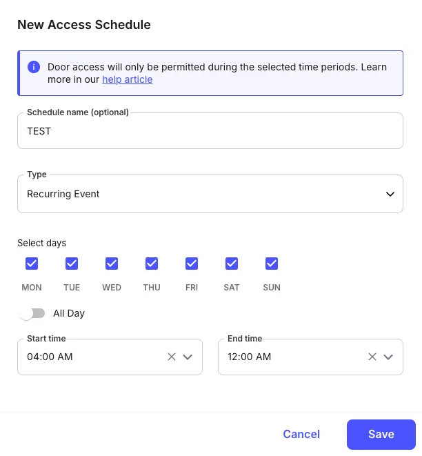 - Ensure “Access schedule” is selected